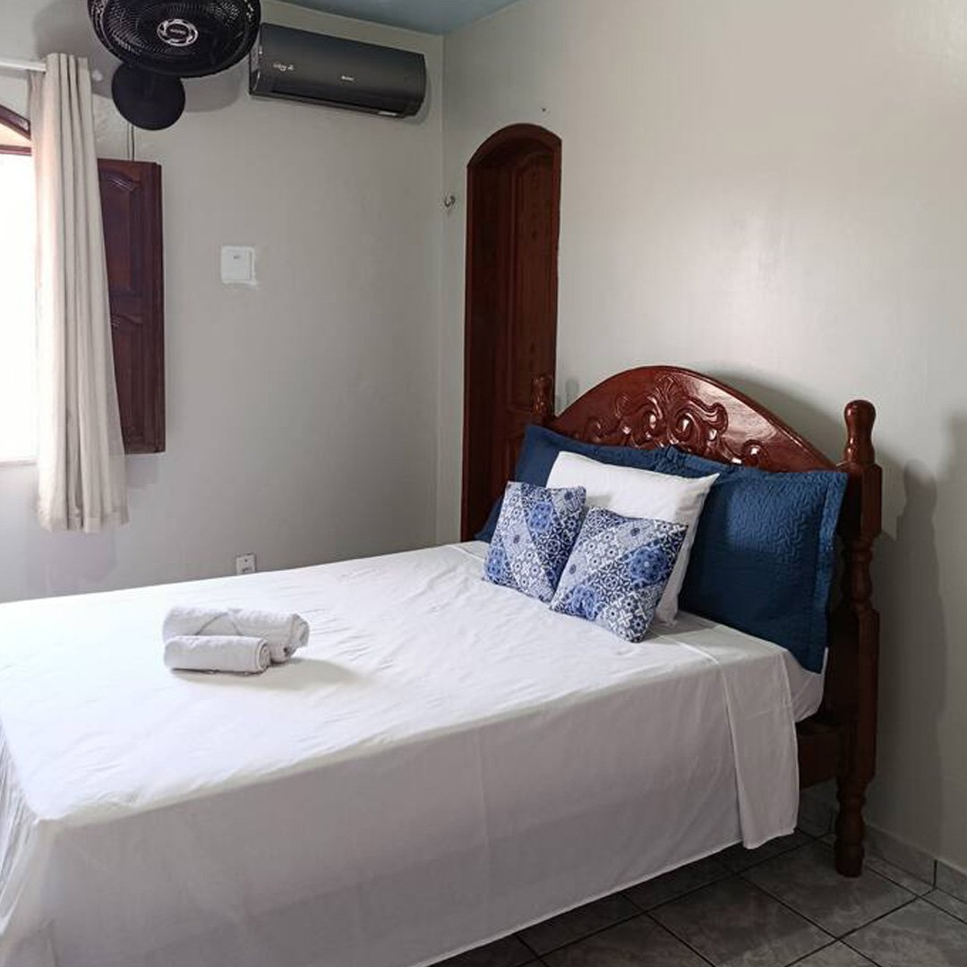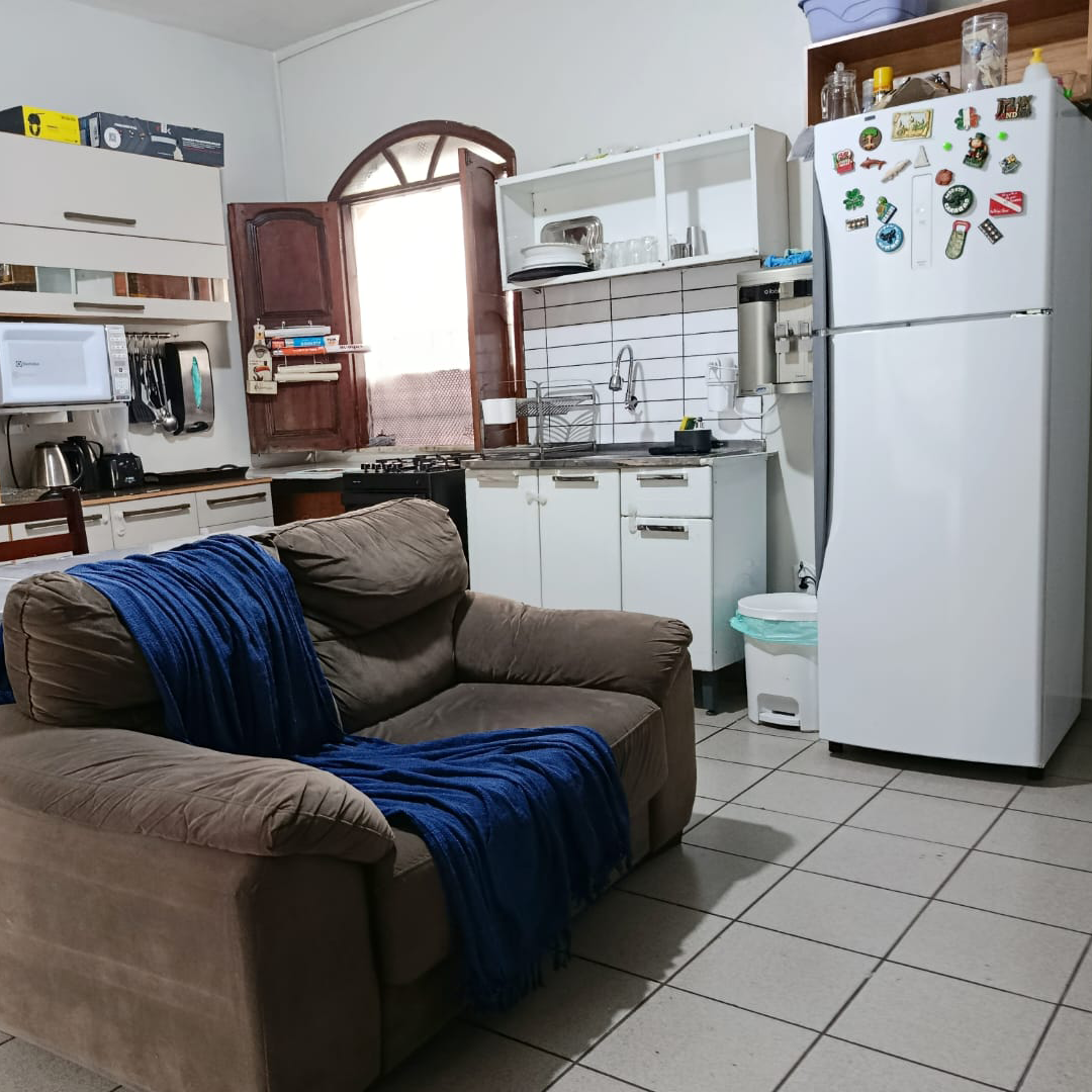 Acomoda até 3 pessoas, mediante valor adicional, com opção de rede ou colchão avulso. A cozinha e a sala são áreas compartilhadas.