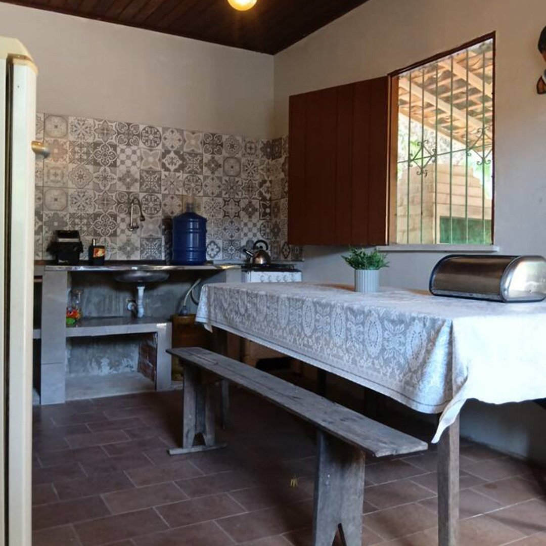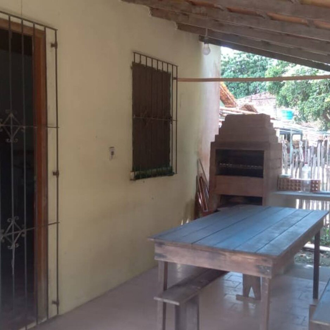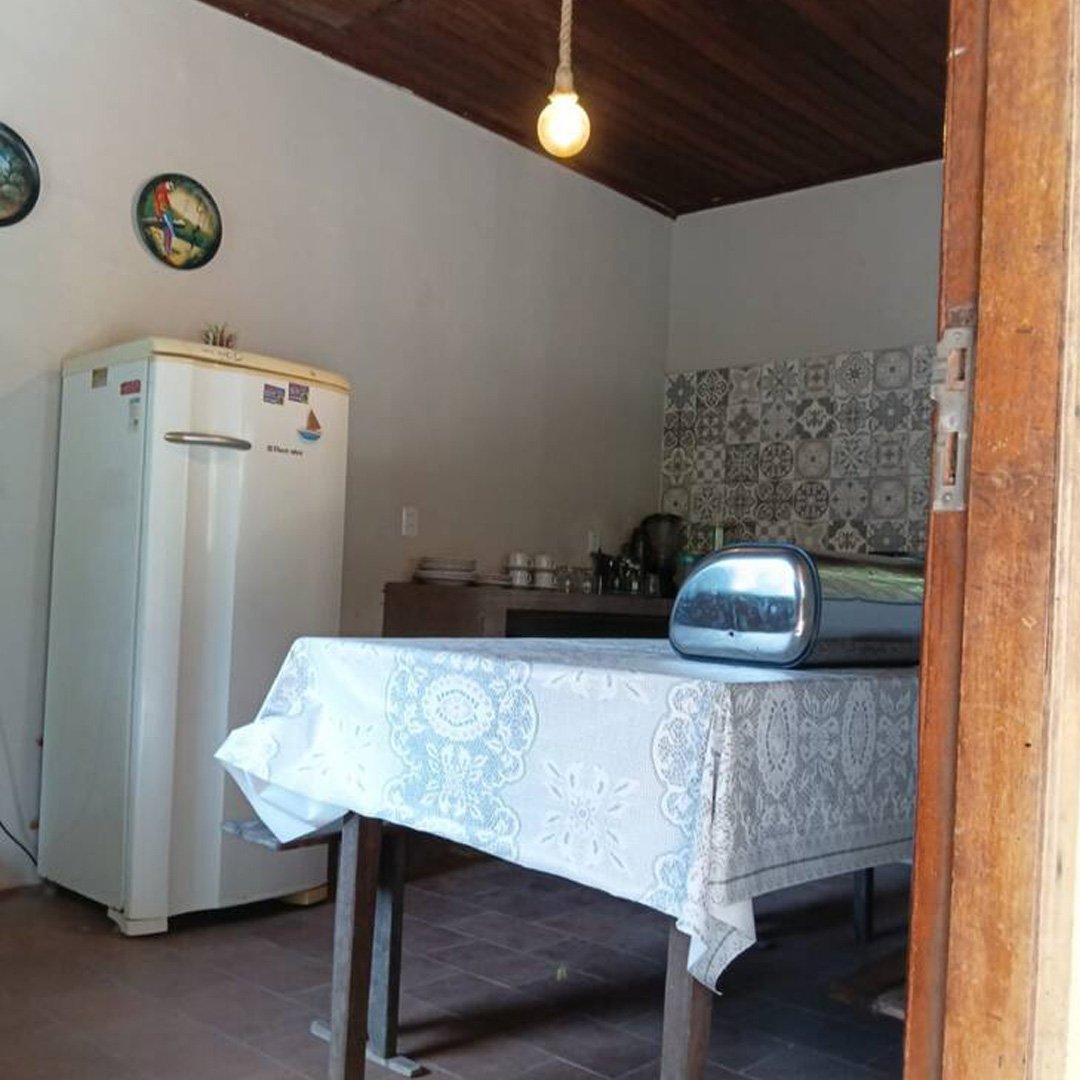 A cozinha é completa, equipada com geladeira, fogão, mesa grande, balcão de apoio em concreto com acabamento em porcelanato, além de louças, panelas e utensílios básicos. No quintal, os hóspedes podem aproveitar a churrasqueira, além de contar com caixa d’água, barracão e um espaço com árvores, ideal para lazer ao ar livre.