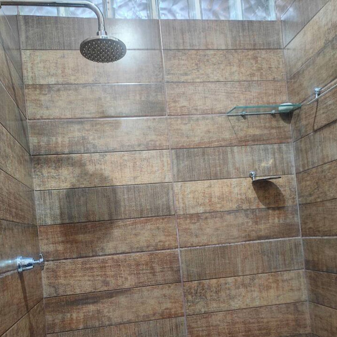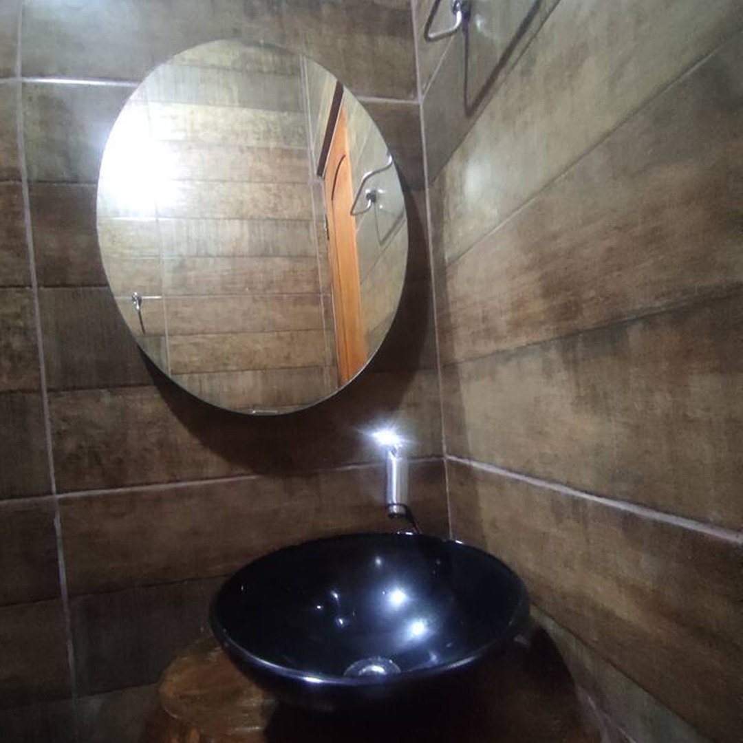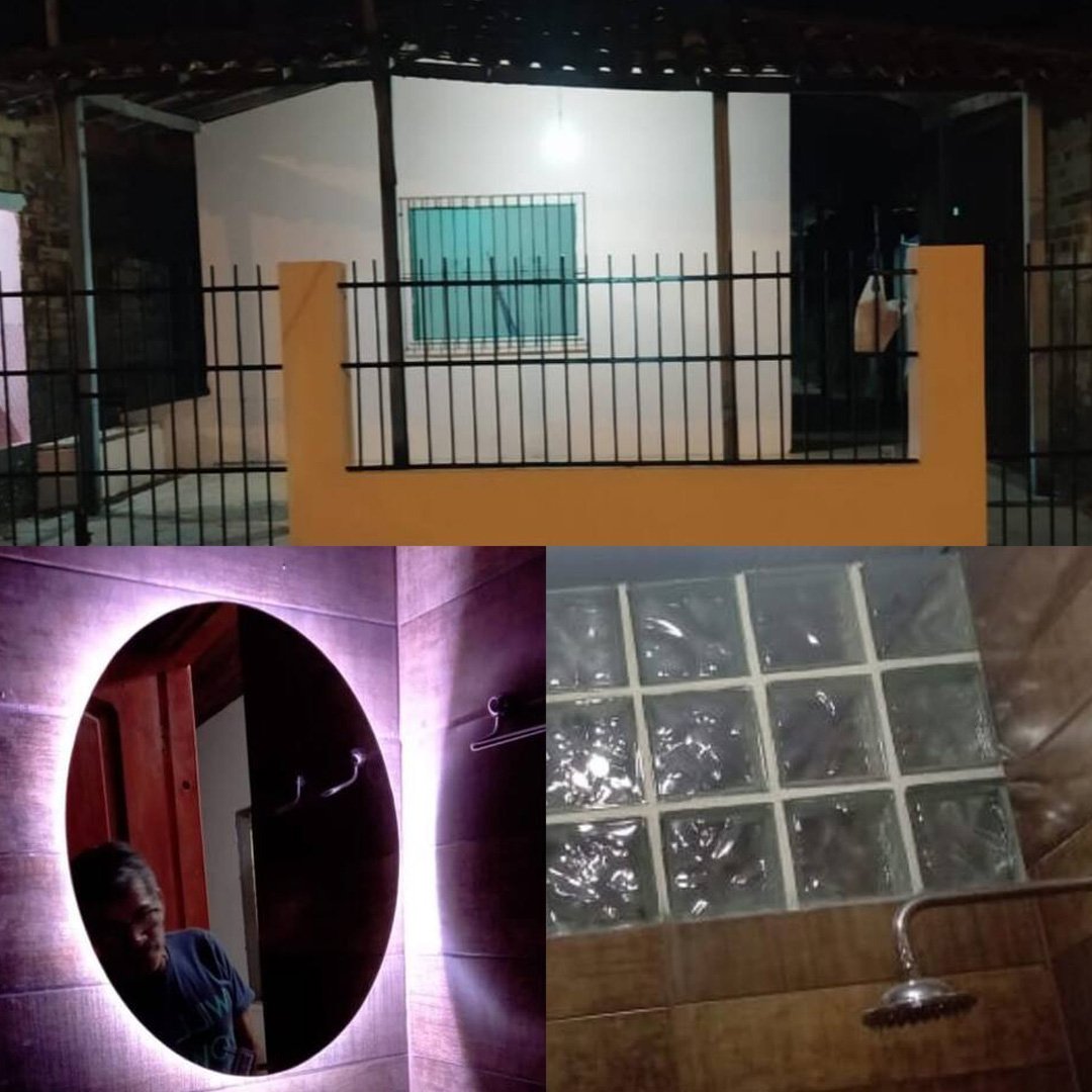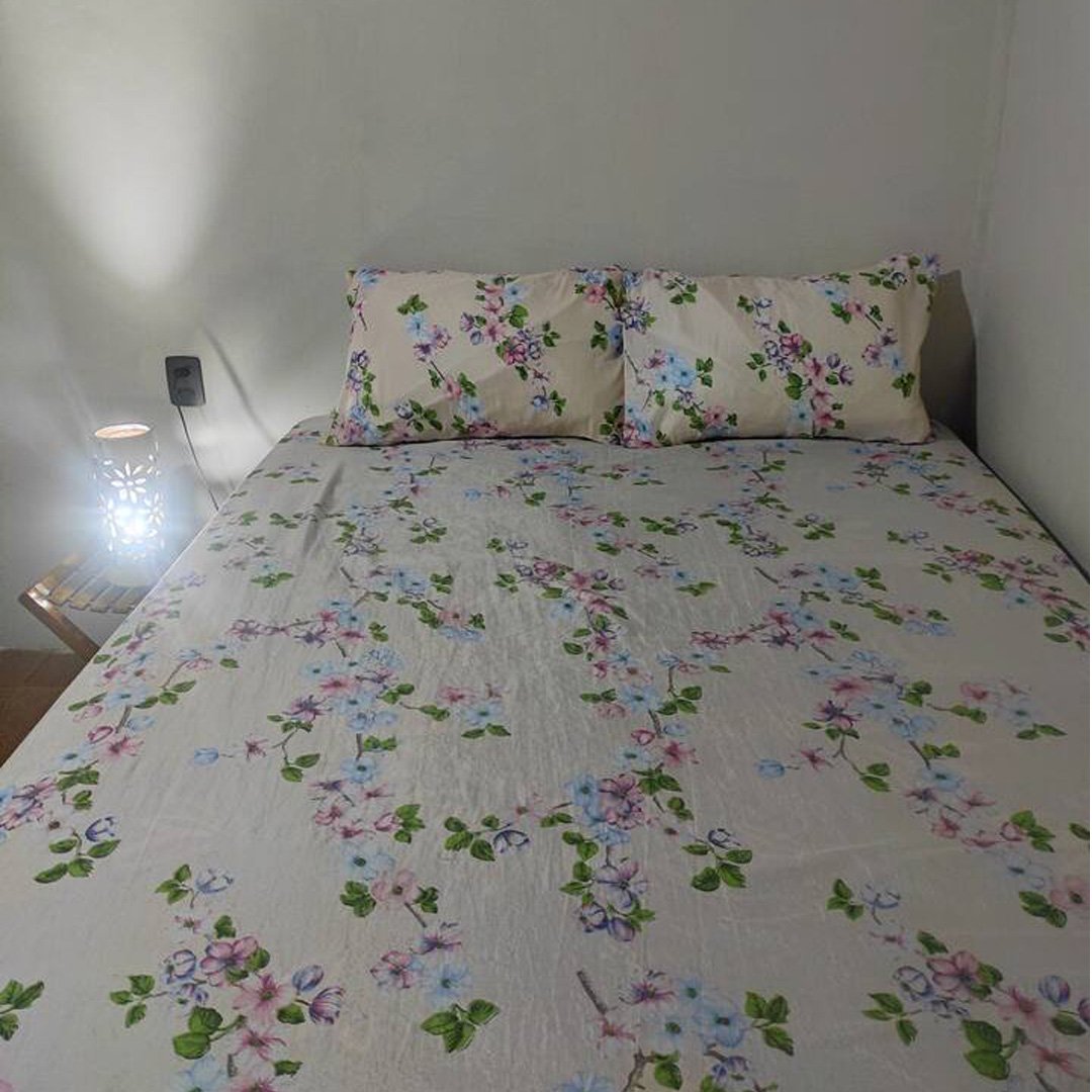 A cozinha é completa, equipada com geladeira, fogão, mesa grande, balcão de apoio em concreto com acabamento em porcelanato, além de louças, panelas e utensílios básicos. No quintal, os hóspedes podem aproveitar a churrasqueira, além de contar com caixa d’água, barracão e um espaço com árvores, ideal para lazer ao ar livre.