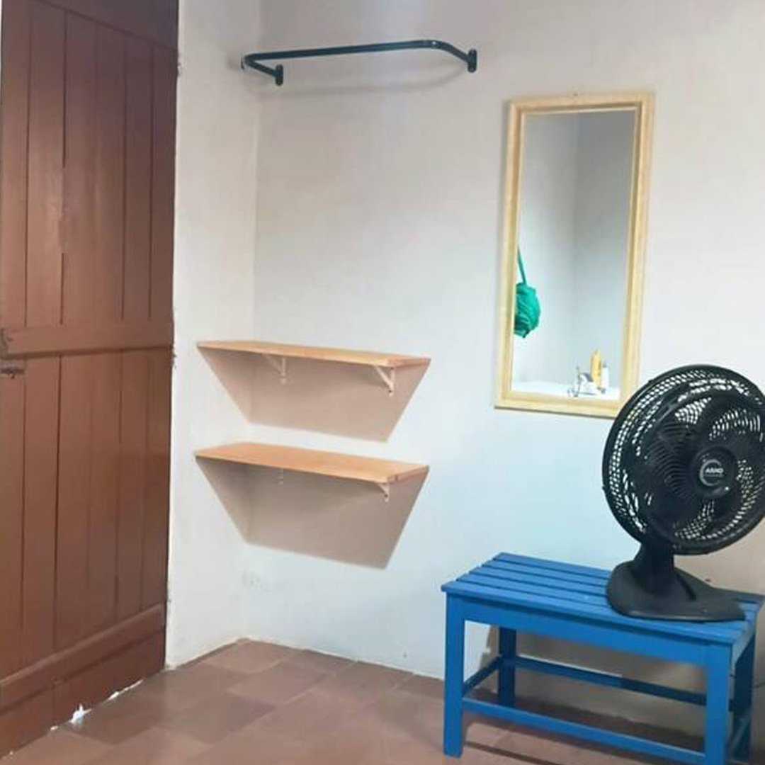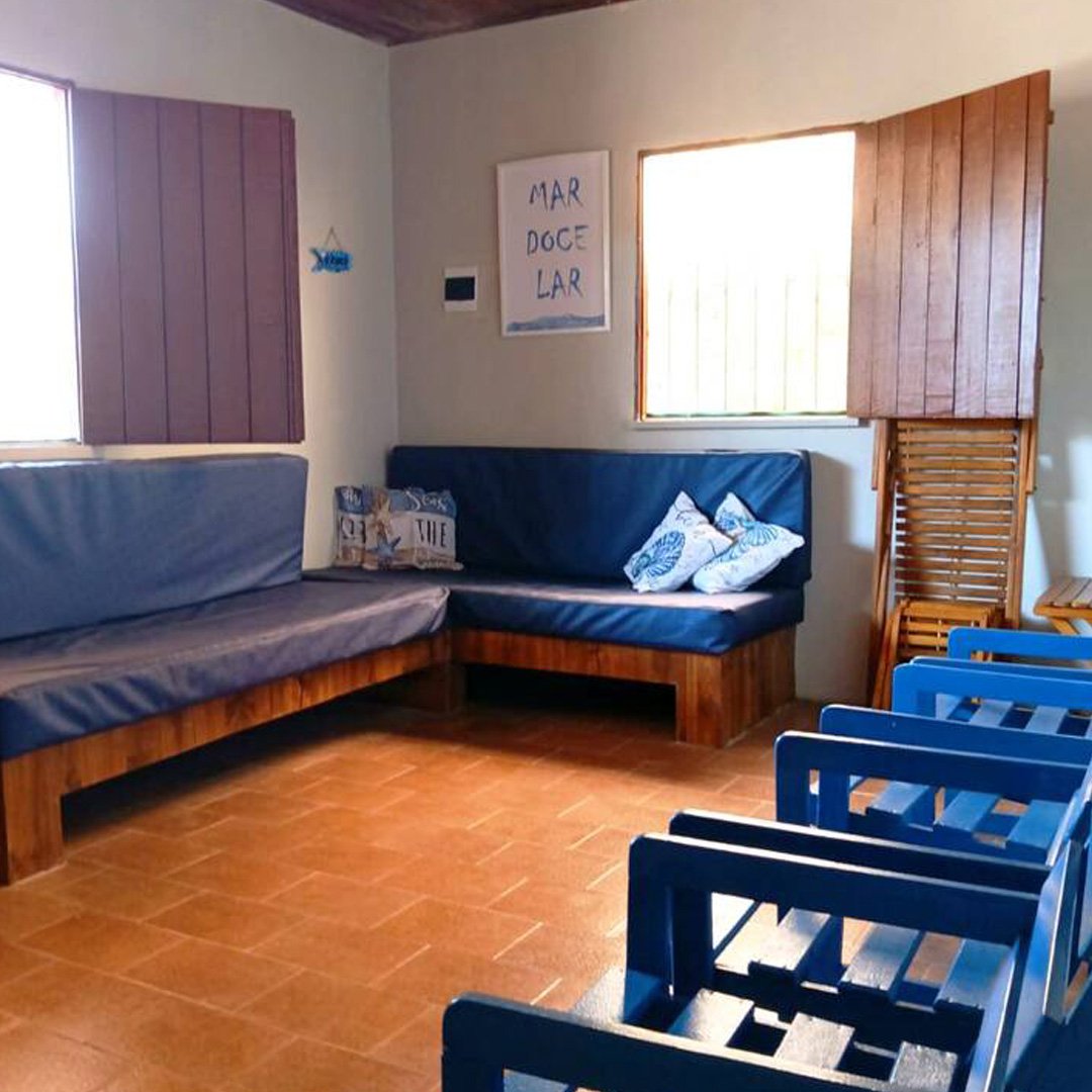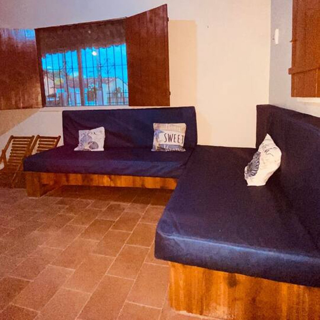 A sala é decorada com tema de praia e possui dois sofás-cama de solteiro (acomoda até 4 pessoas), perfeita para momentos de descanso. Um corredor longo e decorado conecta os ambientes. O imóvel dispõe de dois quartos, sendo uma suíte com banheiro exclusivo e cama de casal e cama de solteiro, espelho, ventilador, cabideiro, e um quarto ventilado também com cama de casal, espelho, ventilador, cabideiro.